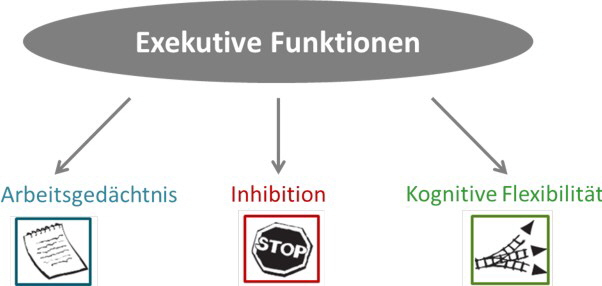 Die Steuerung des bewussten Handelns durch exekutive Funktionen beruht auf dem Zusammenspiel einzelner Teilaspekte. Um sich selbst erfolgreich steuern zu können, muss man automatische Reaktionen hemmen (Inhibition), Informationen im Arbeitsgedächtnis verarbeiten und geistig flexibel sein (Miyake et al., 2000). Diese drei Funktionen steuern als eine Einheit das bewusste Handeln, d.h. das „Sich-im-Griff-haben“ oder auch die „Willenskraft“.