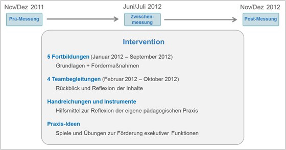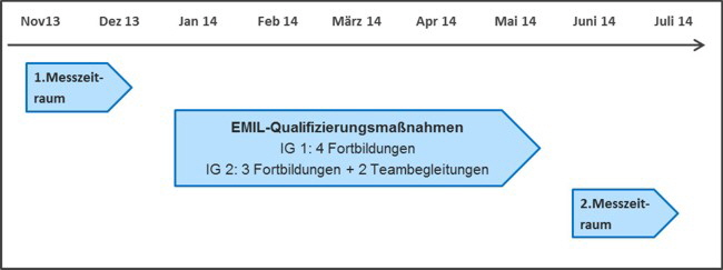 Interventionsgruppe 1 erhielt die EMIL-Qualifizierung in Form von vier Fortbildungen. Interventionsgruppe 2 erhielt drei Fortbildungen und zwei kindergarteninterne Teambegleitungen. Die Anzahl der Qualifizierungsstunden der beiden Gruppen unterschied sich dabei nicht. Die Wartegruppe erhielt zu diesem Zeitpunkt noch keine EMIL-Qualifizierung.