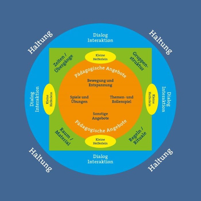 Hier spielen die räumliche Gestaltung und die Darbietung von Material, die zeitlichen Abläufe und Übergänge zwischen Angeboten, die Gruppenzusammensetzung und Altersstruktur sowie die vereinbarten Regeln und Rituale eine bedeutende Rolle.